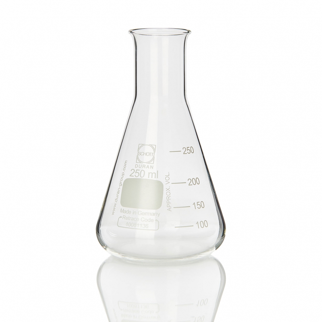 Graduated Schott DURAN glass with reinforced beaded rim and volume scale.